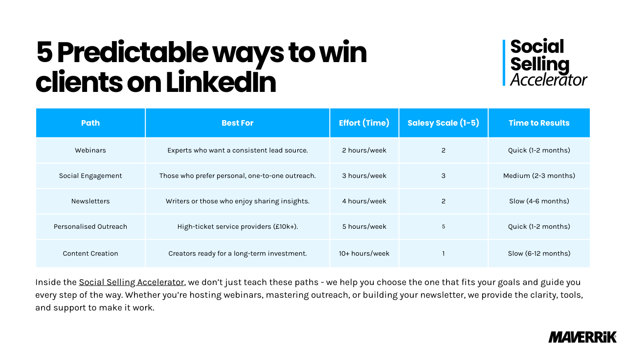 Inside the Social Selling Accelerator, we don’t just teach these paths - we help you choose the one that fits your goals and guide you every step of the way. Whether you’re hosting webinars, mastering outreach, or building your newsletter, we provide the clarity, tools, and support to make it work.