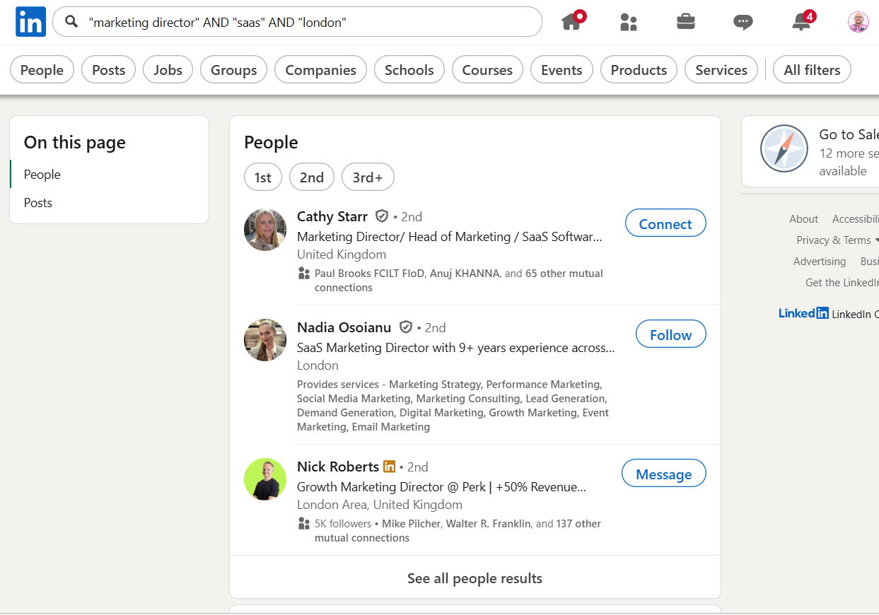 This finds people with “Marketing Director” in their profile, in the SaaS industry, based in London.
