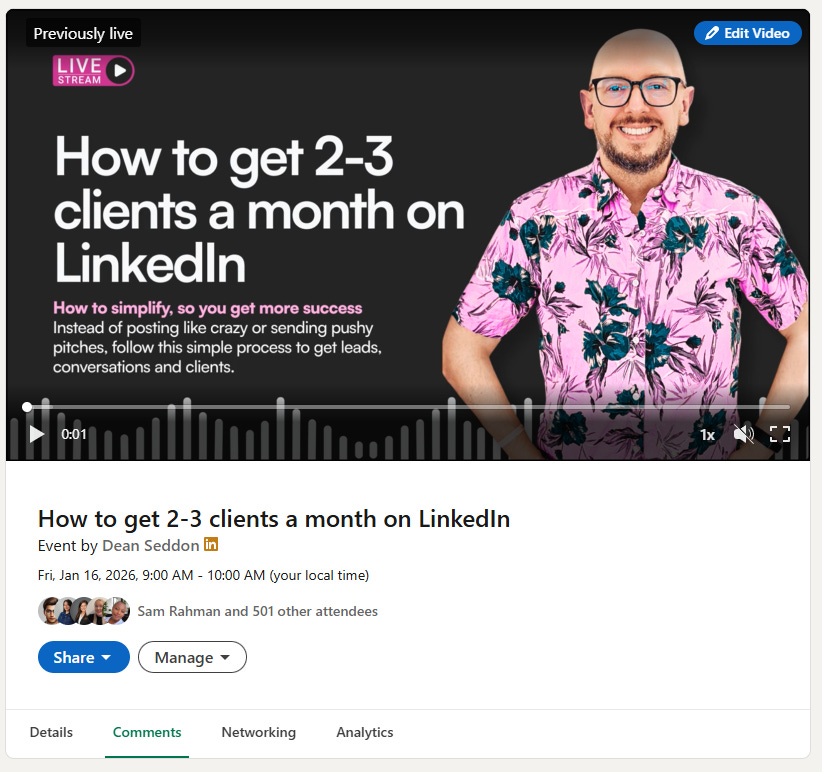 Set up a LinkedIn event with a title focused on an outcome or pain point. Not “Marketing Webinar”. Something like “How to Get 5 Clients Per Month from LinkedIn Without Cold Outreach”.