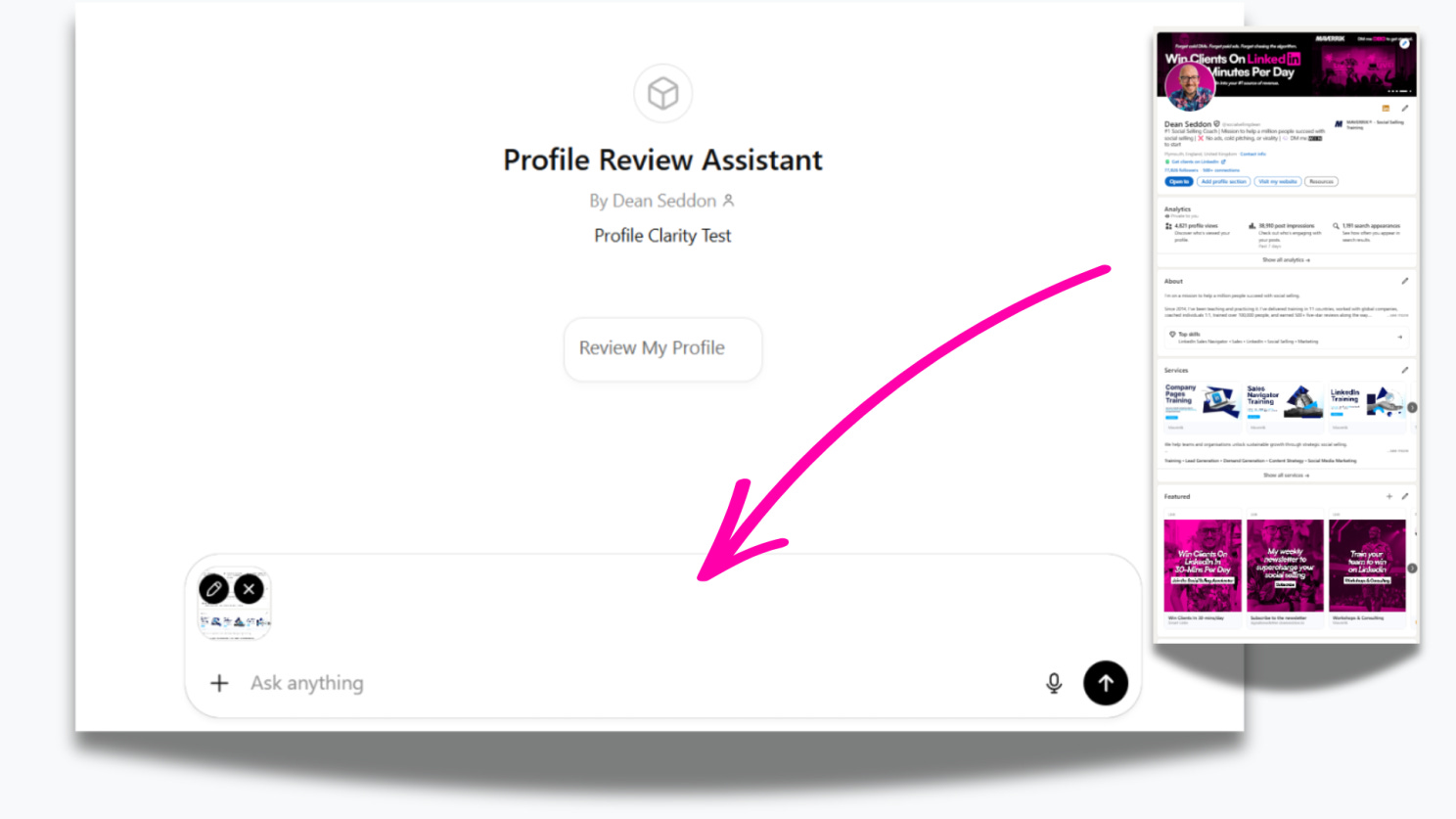 The GPT will then output a review of your profile and give you feedback on how clear you are and if it can see what problem you solve, how you solve it and who you solve it for.